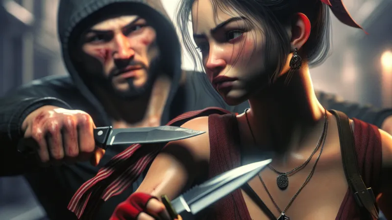 Descrizione di un combattimento tra una giovane combattente armata di coltello e un uomo appartenente a una gang pericolosa