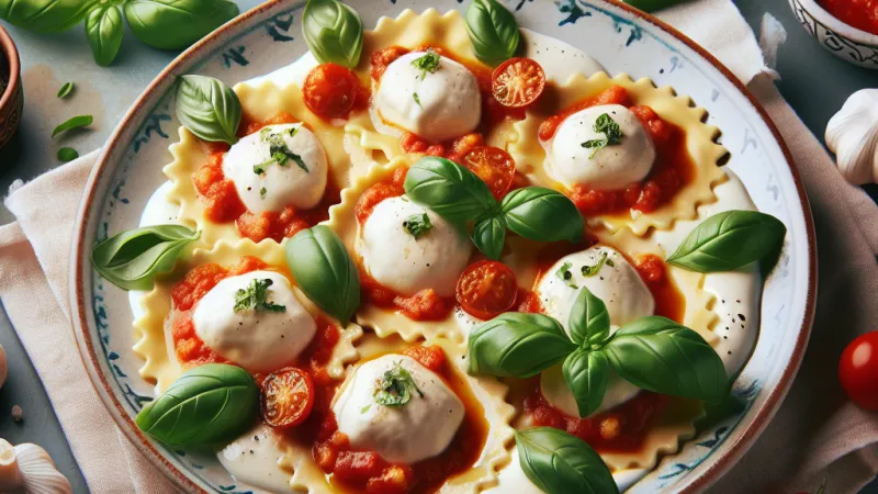 Alla fine, riscrivere il titolo di un piatto non è solo un esercizio di eleganza linguistica, ma un tributo al viaggio degli ingredienti attraverso la storia e la cultura che funge da ponte tra passato e presente. È un invito a concedersi un momento di piacere culinario, assaporando non solo il cibo stesso, ma anche le storie che esso racconta ogni volta che viene servito. "Scrigno di ravioli di ricotta adagiati su crema di stracciatella, con essenza di basilico e salsa di pomodoro" non è solo un titolo, ma un appassionato inno all’arte del cucinare.
